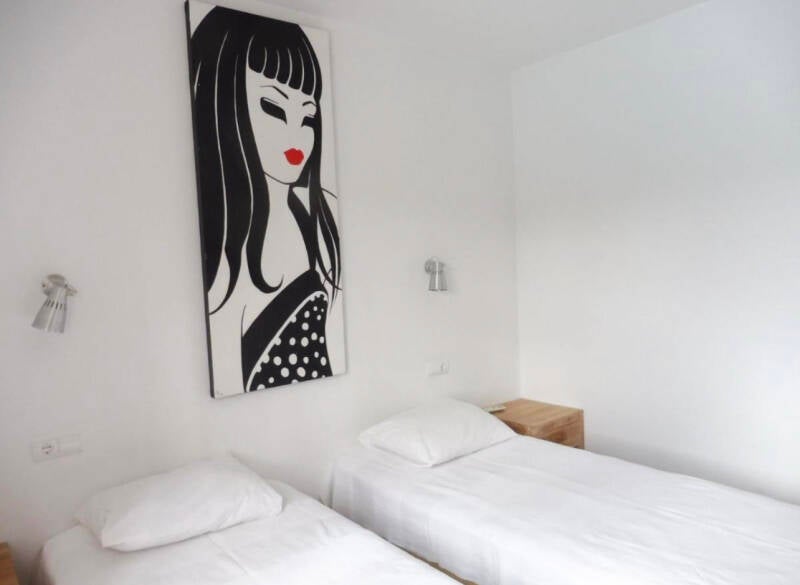 From the entrance, you reach the fully equipped kitchen with a fridge, dishwasher, ceramic hob, oven, and microwave. The washing machine is located in a separate room. From the kitchen, you enter the living room, where the dining area is located and, on a lower level, the sitting area. The latter has a cozy and decorative interior, with comfortable seating. The large sliding door provides access to the terrace. On the ground floor, there are two bedrooms, each with two single beds and a small private bathroom with a shower, sink, and toilet. Upstairs, there is a bedroom with a double bed and a spacious bathroom with a bathtub, shower, sink, and toilet. All rooms have air conditioning. There is also satellite TV, a DVD player, and a CD player.